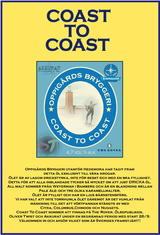 Coast to Coast will be launched on September 26th, which is also the first day of the Stockholm Beer Festival. The beer will exclusively be sold at Oliver Twist and Akkurat in Stockholm and The Rover and Ölrepubliken in Göteborg. It will also be available to sample at the Stockholm Beer Festival.